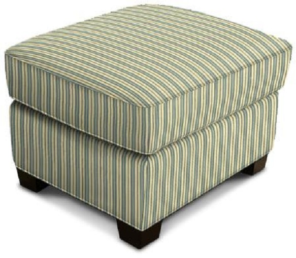 Cunningham Ottoman with dark wooden legs and plush top cushion. The Cunningham collection offers a truly fresh aesthetic to any home with its tight roll arm, clean front rail, and scroll back. This petite scale club chair is available in your choice of our countess striped and plaid fabrics with an optional nailhead trim.