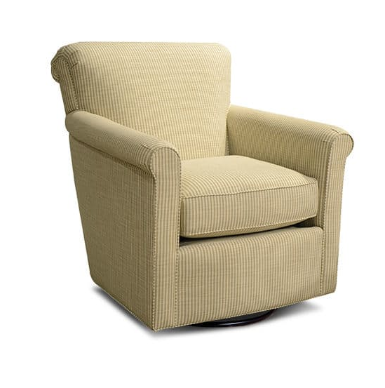 Cunningham Swivel Chair with tight rolled arms and plush seat cushion. Use it in your living area to fill an empty corner in your home office or bedroom… you can't go wrong! Available as a swivel chair, stationary chair, ottoman, and settee. Take a look at Jakson and Lillian if you prefer non-matched covers or leather.