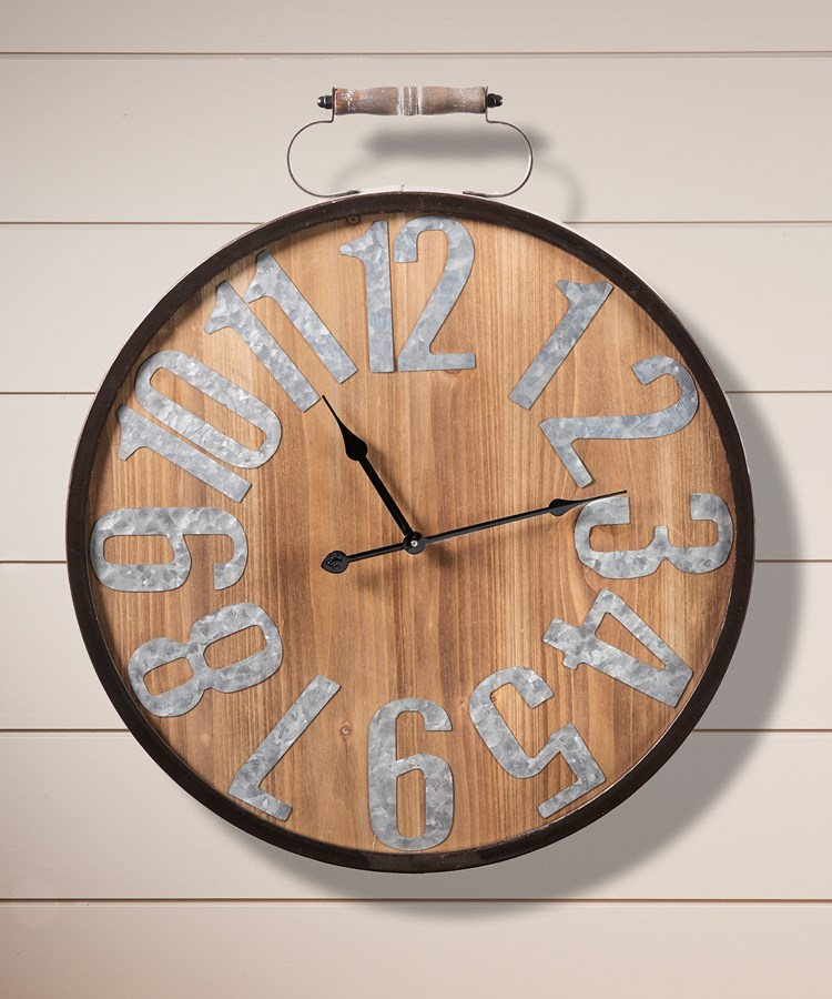 Round pocket watch design wall clock. Wood plank design background, frame and numbers finished in galvanized metal.Read More