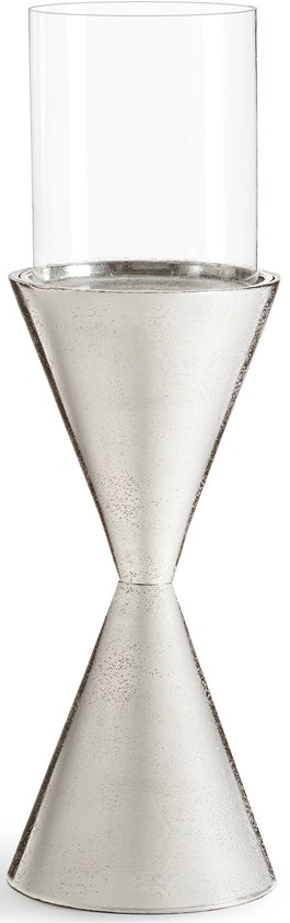 Beautifully crafted candle holder styled with a nickel finish hourglass base and clear glass sleeve.Read More