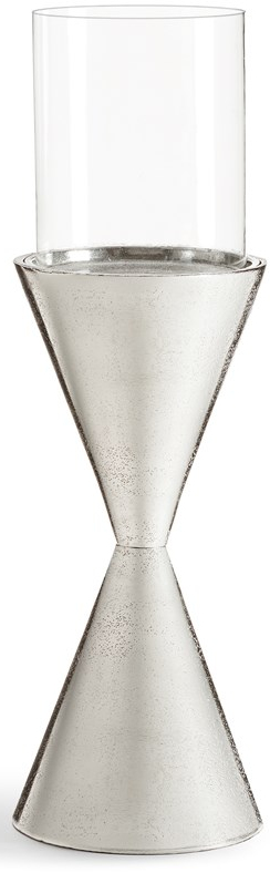 Add a contemporary look to any space with this candle holder styled with a nickel finish hourglass base and clear glass sleeve.Read More