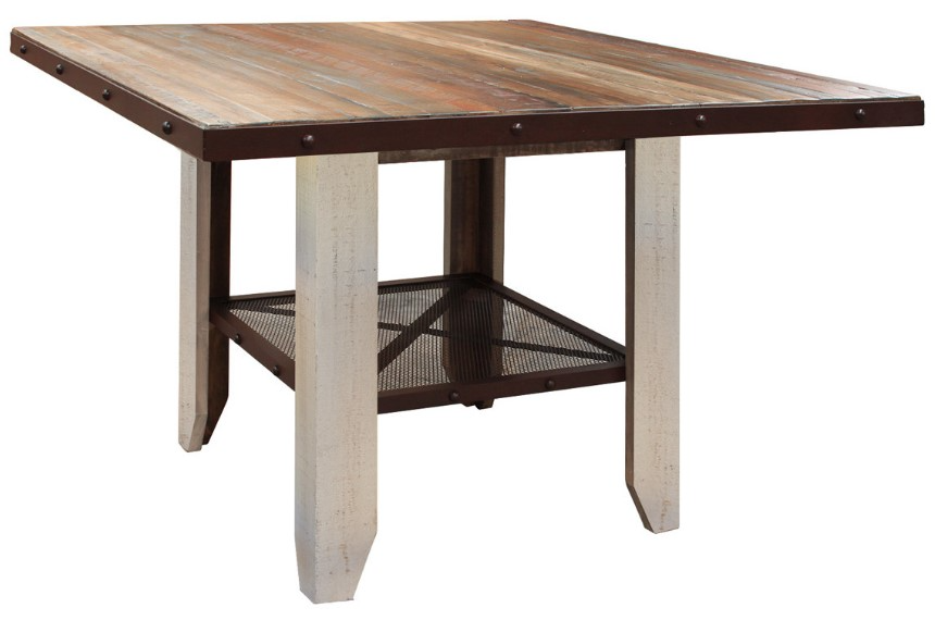Counter-height table features hand-wrought shelf for extra storage