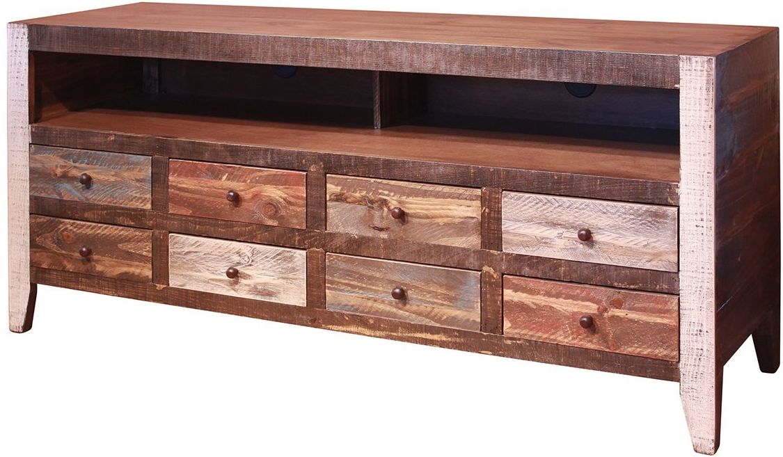 Six-step, soft multi-colored finish on hand distressed wood provides an antique look.