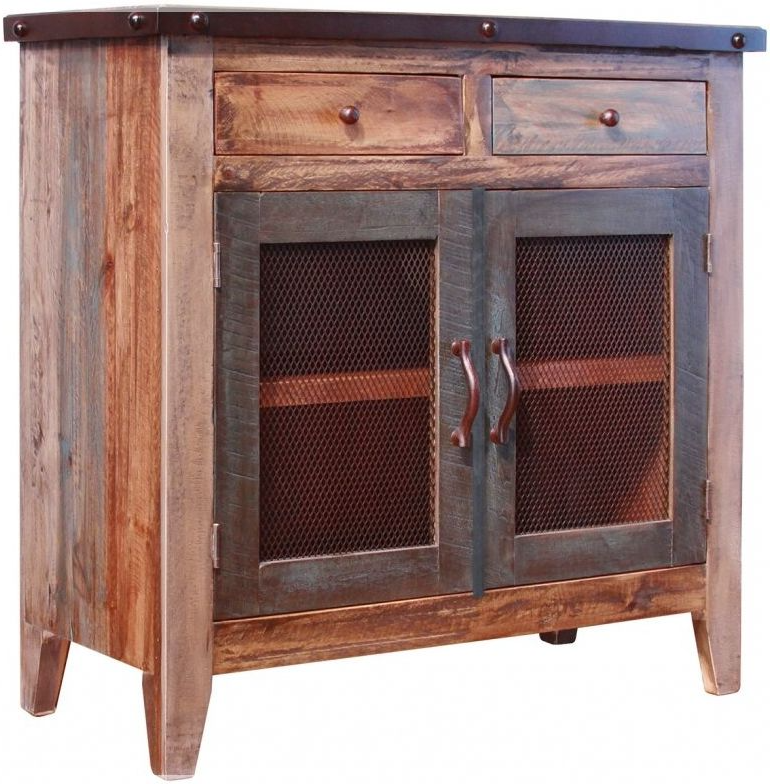 Two functional drawers and one shelf behind iron mesh paneled doors.