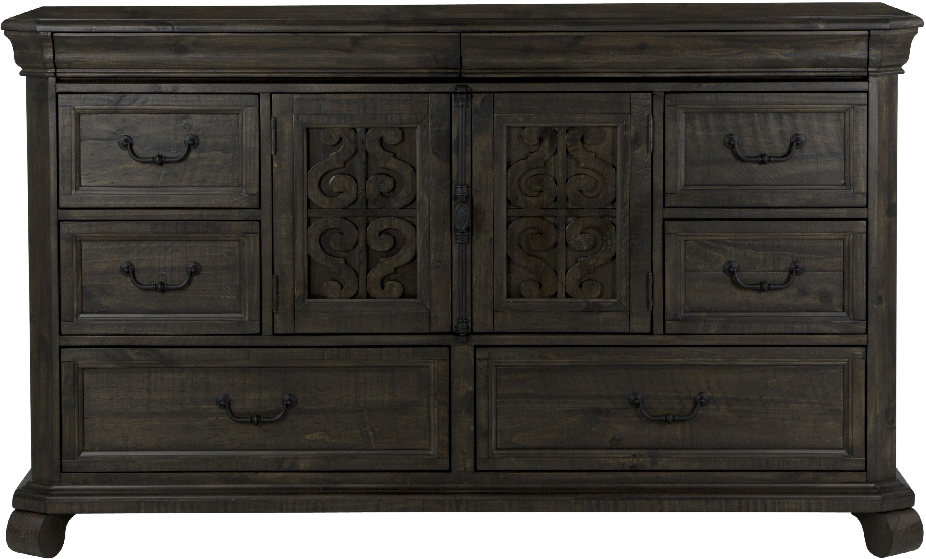 Warm and inviting like an old French friend, Bellamy welcomes with European inspired styling in a unique Peppercorn finish and matte black pewter accented hardware. Scrolling open woodwork adorns the well appointed media chest doors while roomy dressers and chests feature rounded corners atop rounded bun feet.Read More