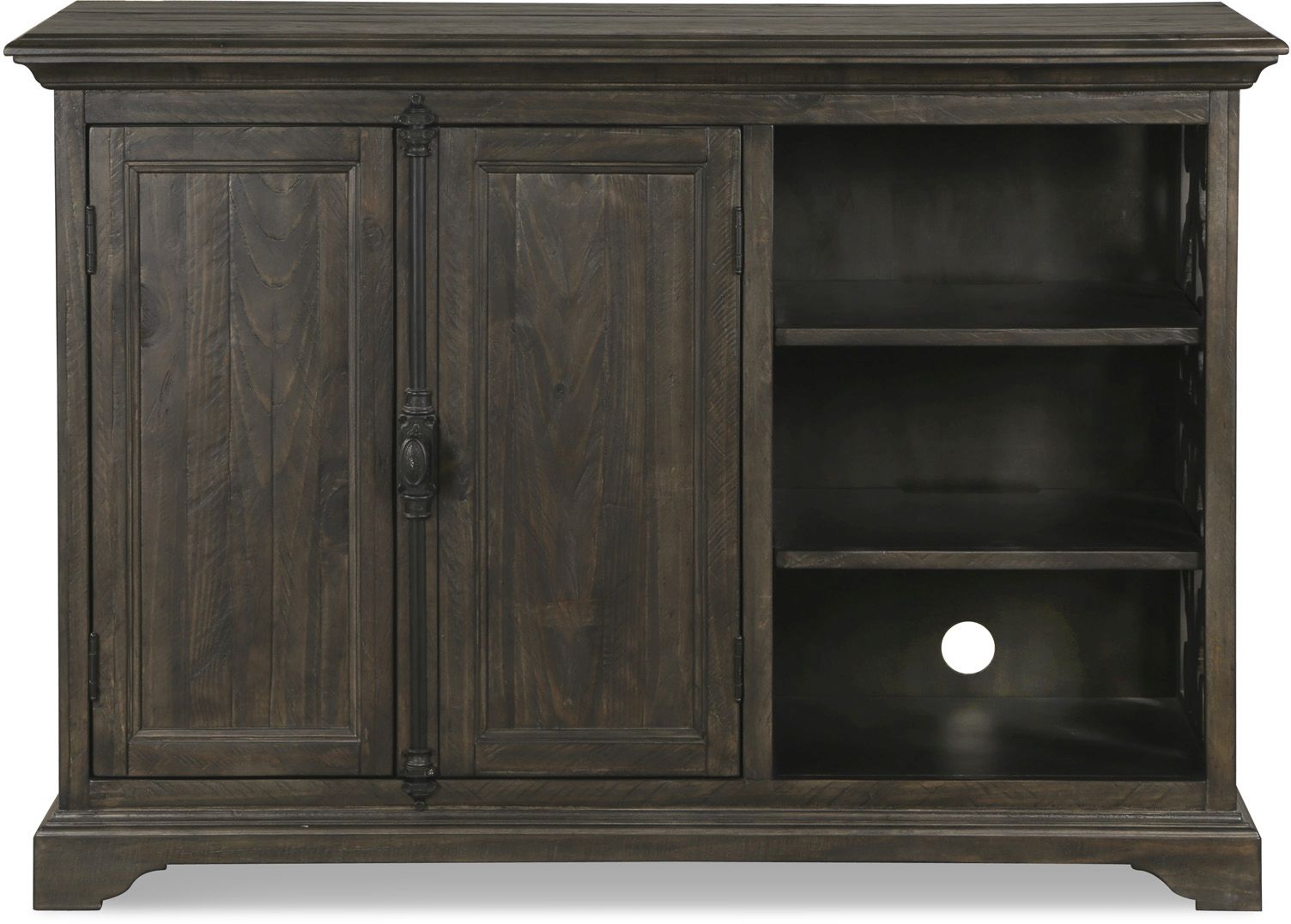 Old world charm abounds with pine solids and veneers, matte black with pewter highlights.