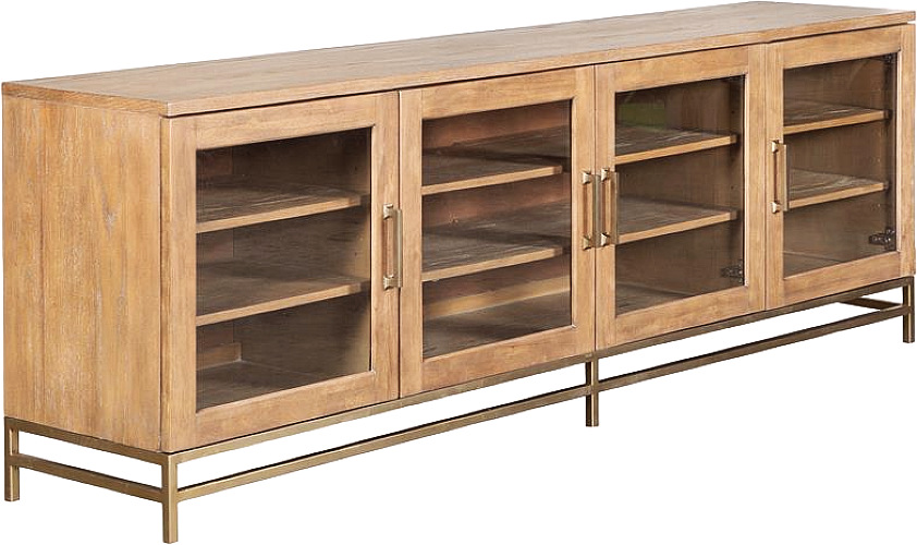 Lindon is available in two sizes (70-inch and 84-inch) and offered in a choice of Belgian Wheat or Coffee Bean finish accented with Burnished Brass Hardware. Its multifunctional design includes four framed, clear-glass doors that each open to reveal two interior adjustable shelves perfect for media storage and display. The 70-inch console is designed to display a TV up to 79”, the 84-inch model is designed for TV sizes up to 90”, and both add instant character to the room.
