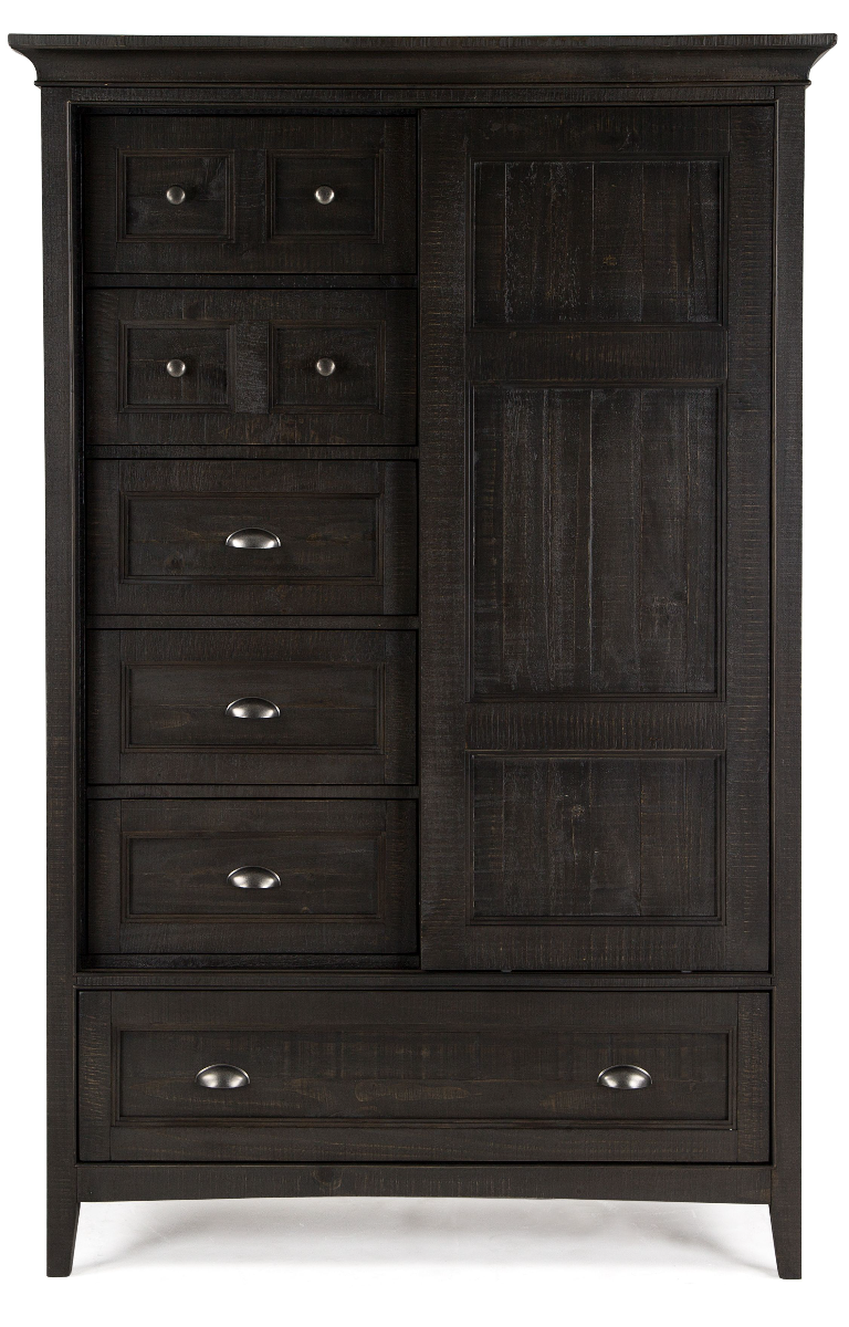 The trendy Graphite finish on Pine veneers and solids, accented by aged pewter hardware displays the beaded, framed panel drawers over straight shaker inspired legs handsomely. The rectangular panel bed offers a welcome respite as well a storage rails option while the cases provide additional generous space management.Read More