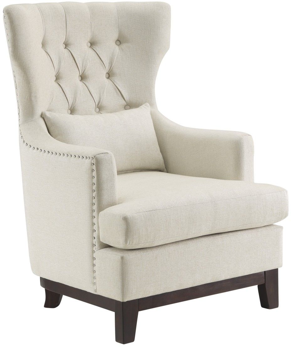 The visual and textural statement of the elegant Adriano Collection lends distinct accent to your home’s décor. Wing-backed, as a nod to traditional form, and covered in woven beige fabric, the chair features nailhead accent and button-tufting, further enhancing the tailored styling.Read More