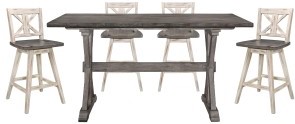 A gray finish graces the solid rubberwood dining group highlighting the veneer. Providing visual interest beyond the classic styling, are the alternate finishes of the accompanying chairs, offered in black sand-though and white sand-through. The chairs also feature a swivel mechanism, lending to ease of motion while seated.Read More