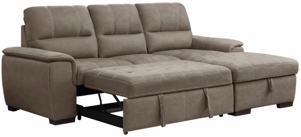 Conveniently stored beneath the sofa is a pull out trundle that rises to create a bed while the top of the attached chaise opens to reveal ample storage space. The sofa is offered in gray textured plush microfiber with contrast stitching.Read More