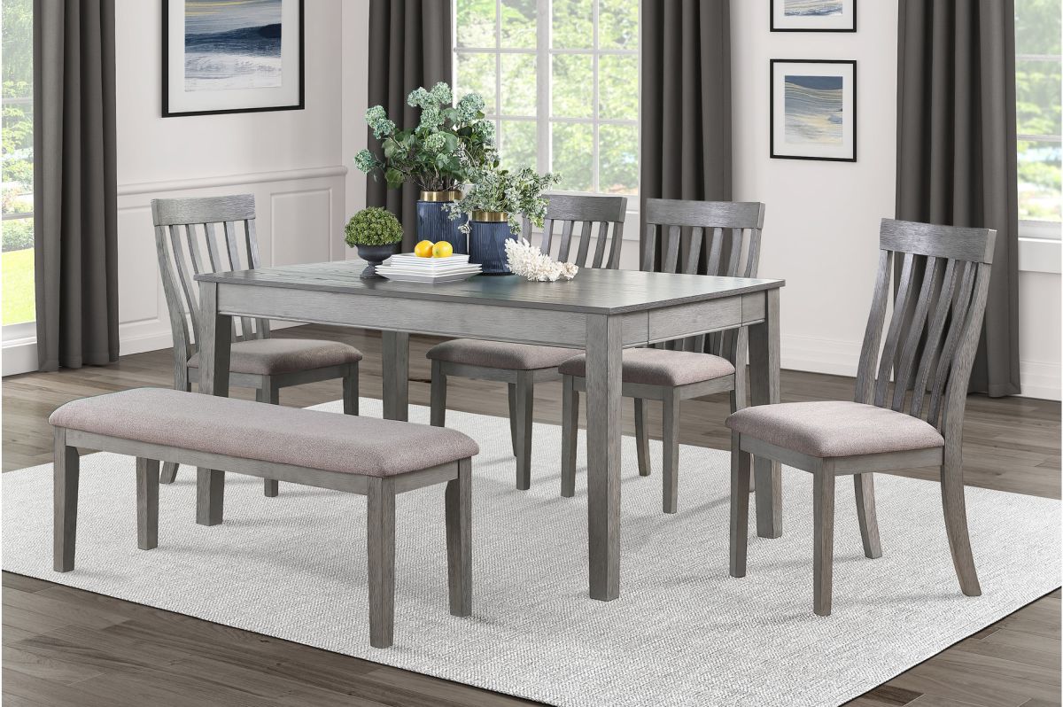 Includes 1 table, 4 side chairs and 1 bench