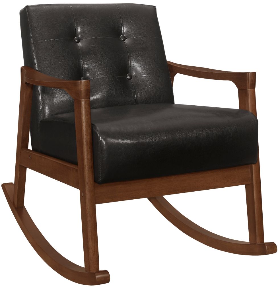 Mid-Century Modern lines define the profile of the Auden Collection rocking chair. Contoured arms top the framing of the rocker rails. The button-tufted back and plain seat of the chair are covered in dark brown faux leather upholstery, with walnut finish over solid wood.Read More