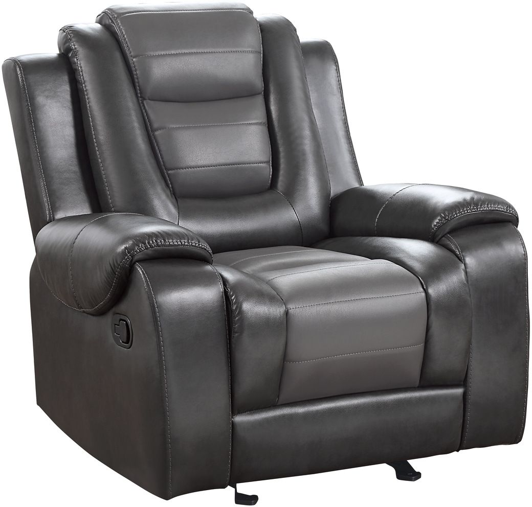 The glider reclining chair has a manual motion mechanism that is operated with the pull of a side-mounted tab, that once engaged, takes you from seated to reclined in an easy motion.