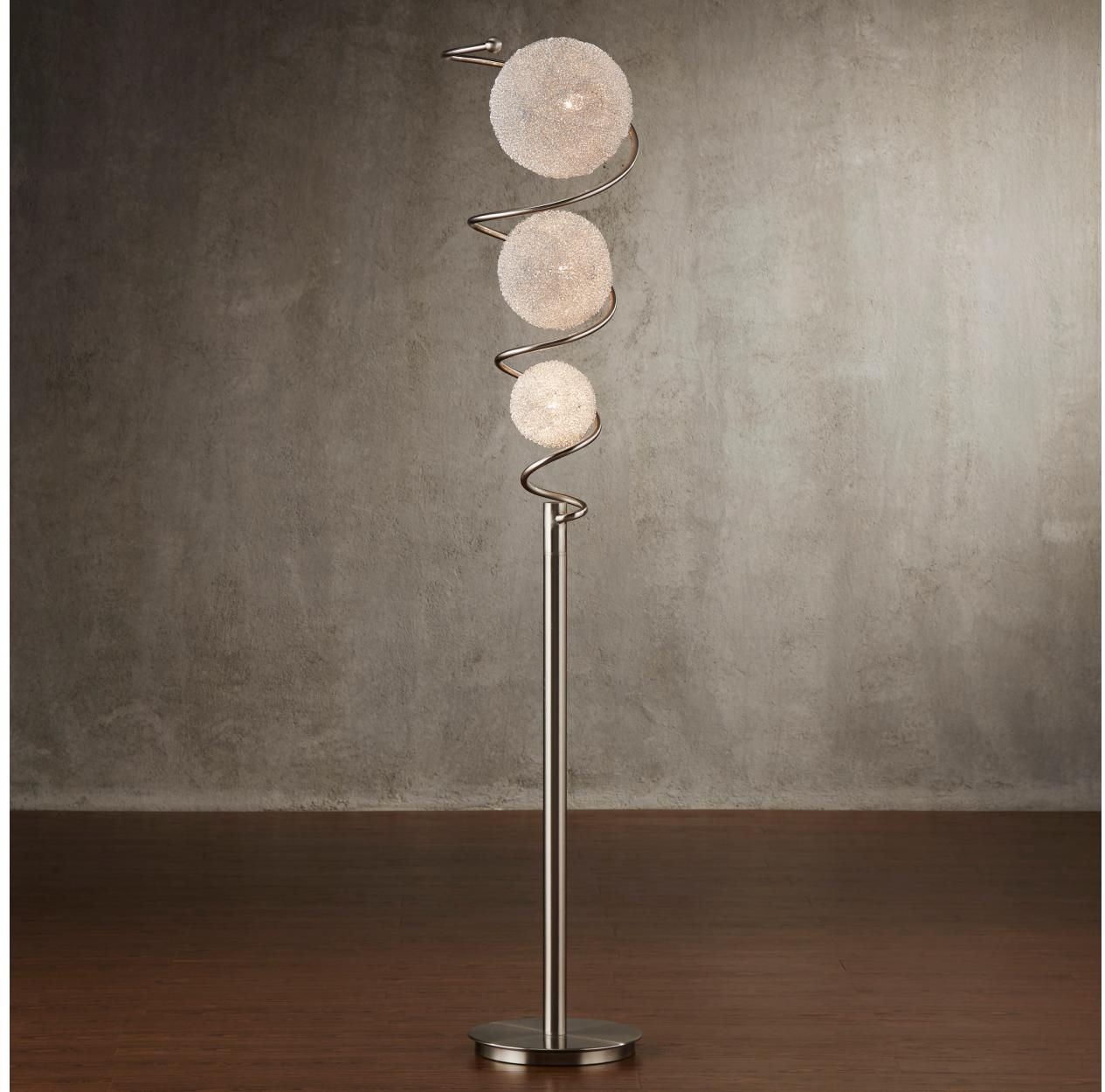 The metal Saturn three orbs accent light gravity defying design features three aluminum wrapped sparkling orbs suspended mid-air, illuminating warm white light rays. The piece is beautifully crafted using high quality satin nickel finish metal. Great accent lighting floor lamp that can enhance the surrounding ambiance, perfect for a night light, or a mood light to brighten up any room.Read More
