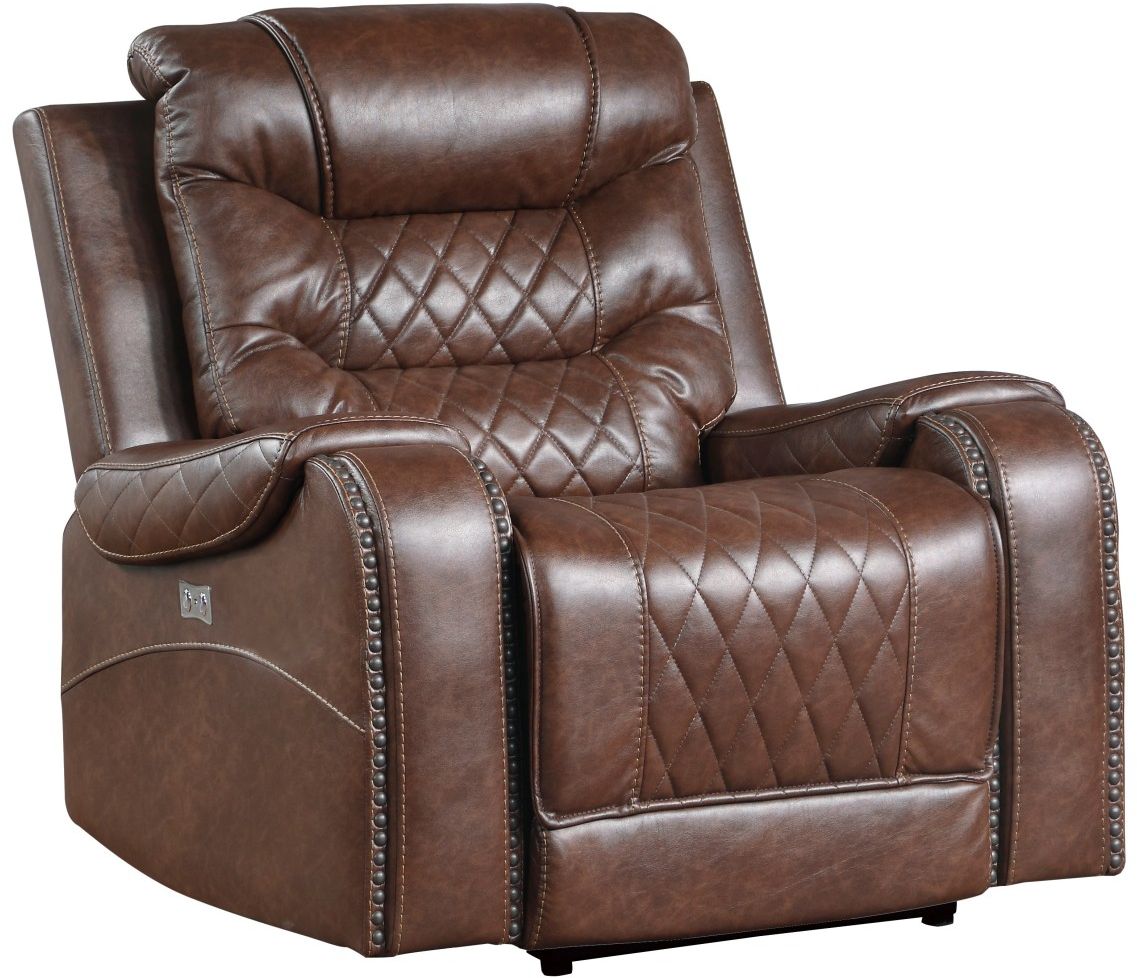 The Putnam Collection is offered in brown polished microfiber fabric with diamond pattern stitching with nailhead-adorned arms for classic decorative effect.