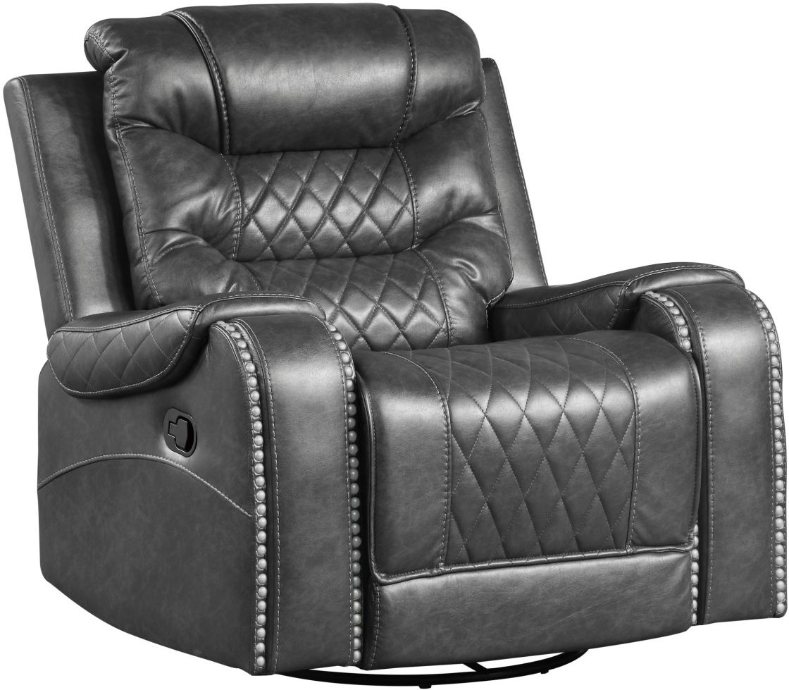 The Putnam Collection is offered in gray polished microfiber fabric with diamond pattern stitching with nailhead-adorned arms for classic decorative effect.