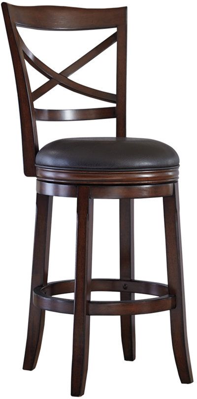 Raise your design bar with the Porter x-backed swivel bar height barstool. Lean back against the cross back design, settle your long legs on the all-around footrest, and enjoy the 360° swivel design. With flared and tapered lines, cherry-tone finish, and brown faux leather upholstery, show off your mellow design flair. Sit up at the bar in your casual home with this barstool by Millennium® by Ashley®.