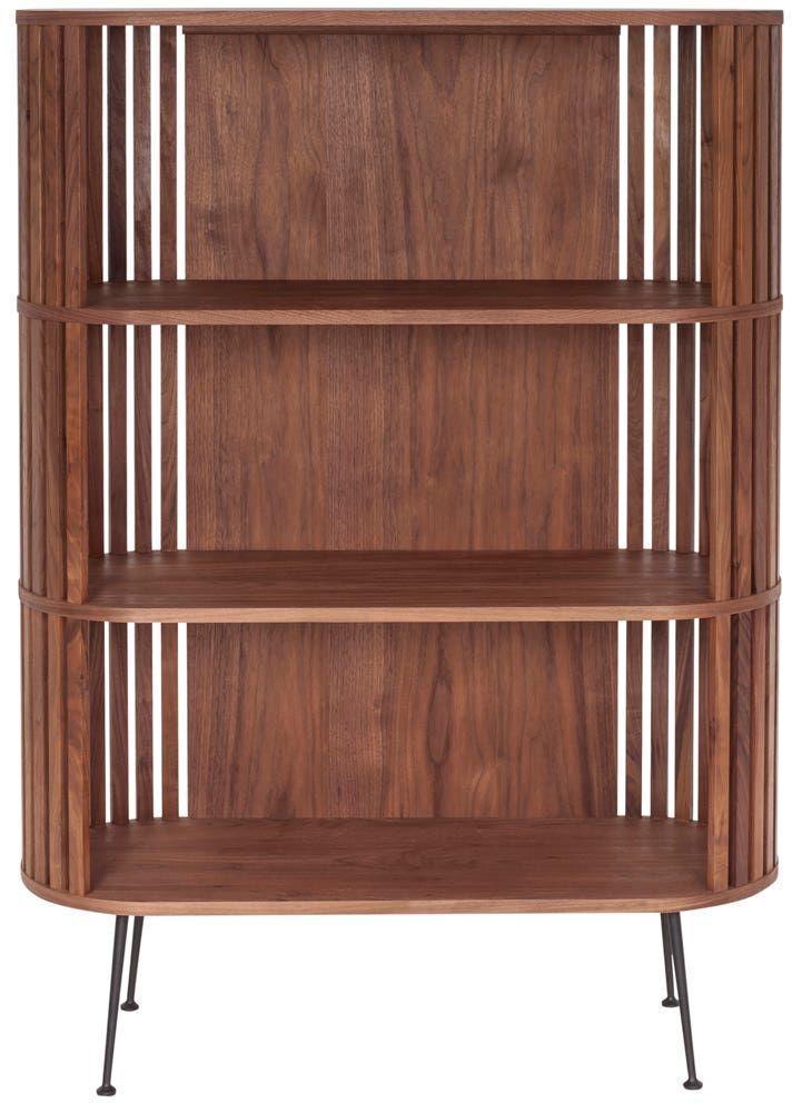 Mid-century modern style with a gently rounded form and gated paneling that details its sides and back, with slightly flared steel legs. Practically perfect, this bookshelf is a multi-functional style that works from room to room.