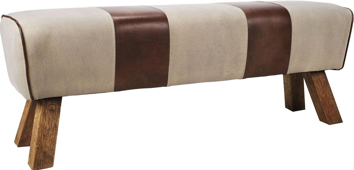 Taking inspiration from the sports world, this eclectic bench is accurately made with leather and canvas. This bench is upholstered with leather and canvas material. Careful with the gymnastics though, it's only 18 inches high!Read More
