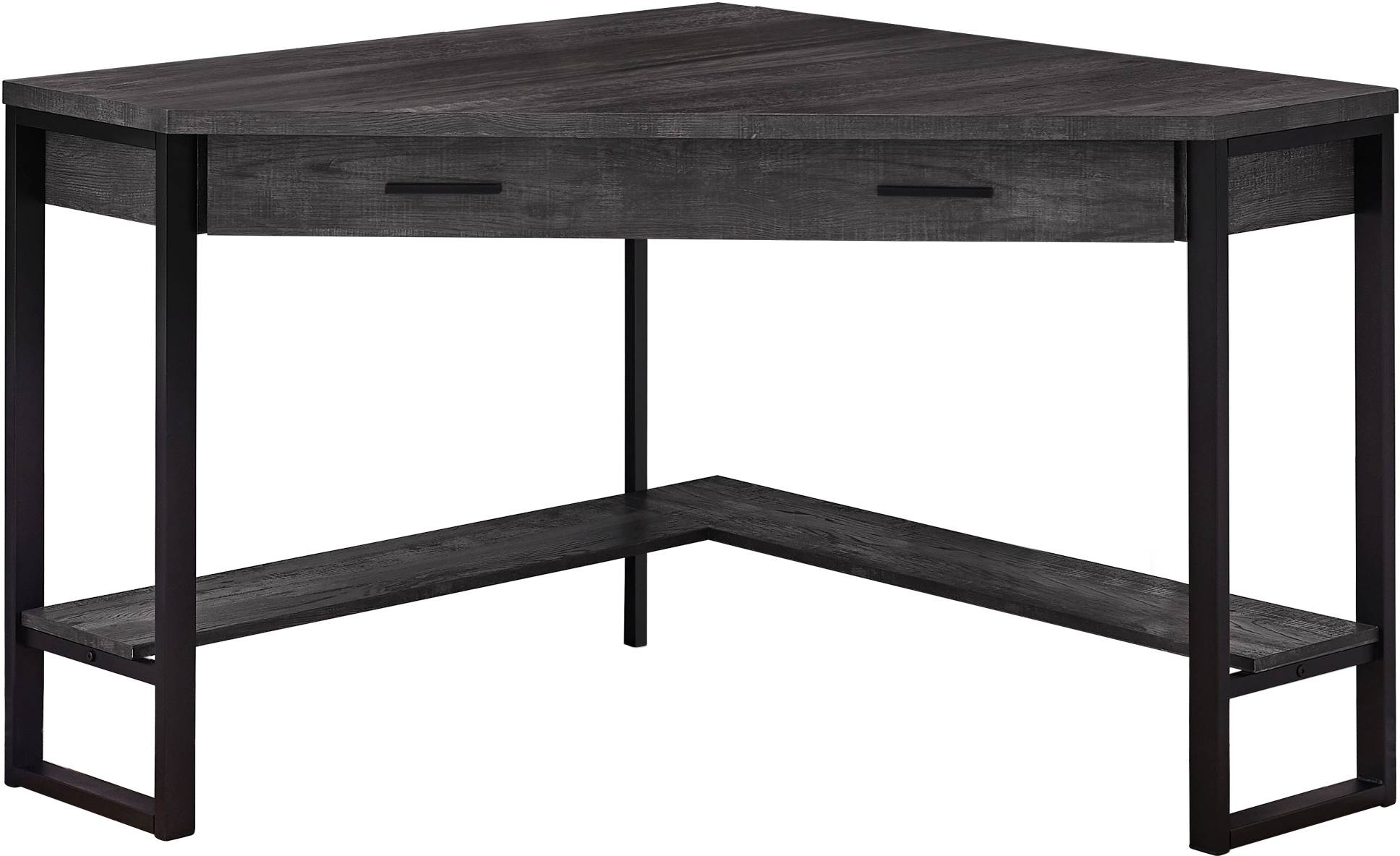 Making perfect use of valuable corner space in your small home, apartment or condo, this black reclaimed wood look angular desk is there to help you have a positive workstation experience. Featuring a long drawer on smooth metal glides, the office desk also has a bottom shelf all around for extra storage space. The thick panel desktop is supported by a robust black metal frame to ensure sturdiness. This computer desk has everything you need to complete or start a home office.