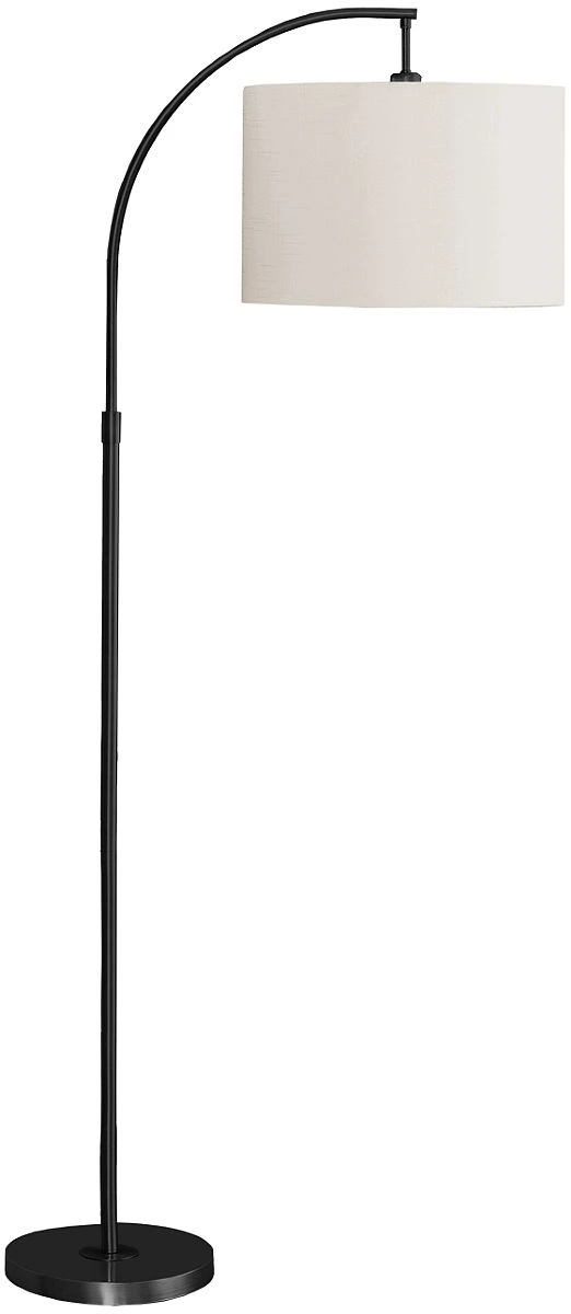 Brighten up your space with this sleek and stylish 65" h arc floor lamp in black metal topped with a chic ivory drum shade. Holding up to a 100W standard bulb (not included) and a convenient on/off foot switch, this contemporary lamp is the perfect functional and decorative lighting piece to brighten a living room, bedroom, or office.Read More