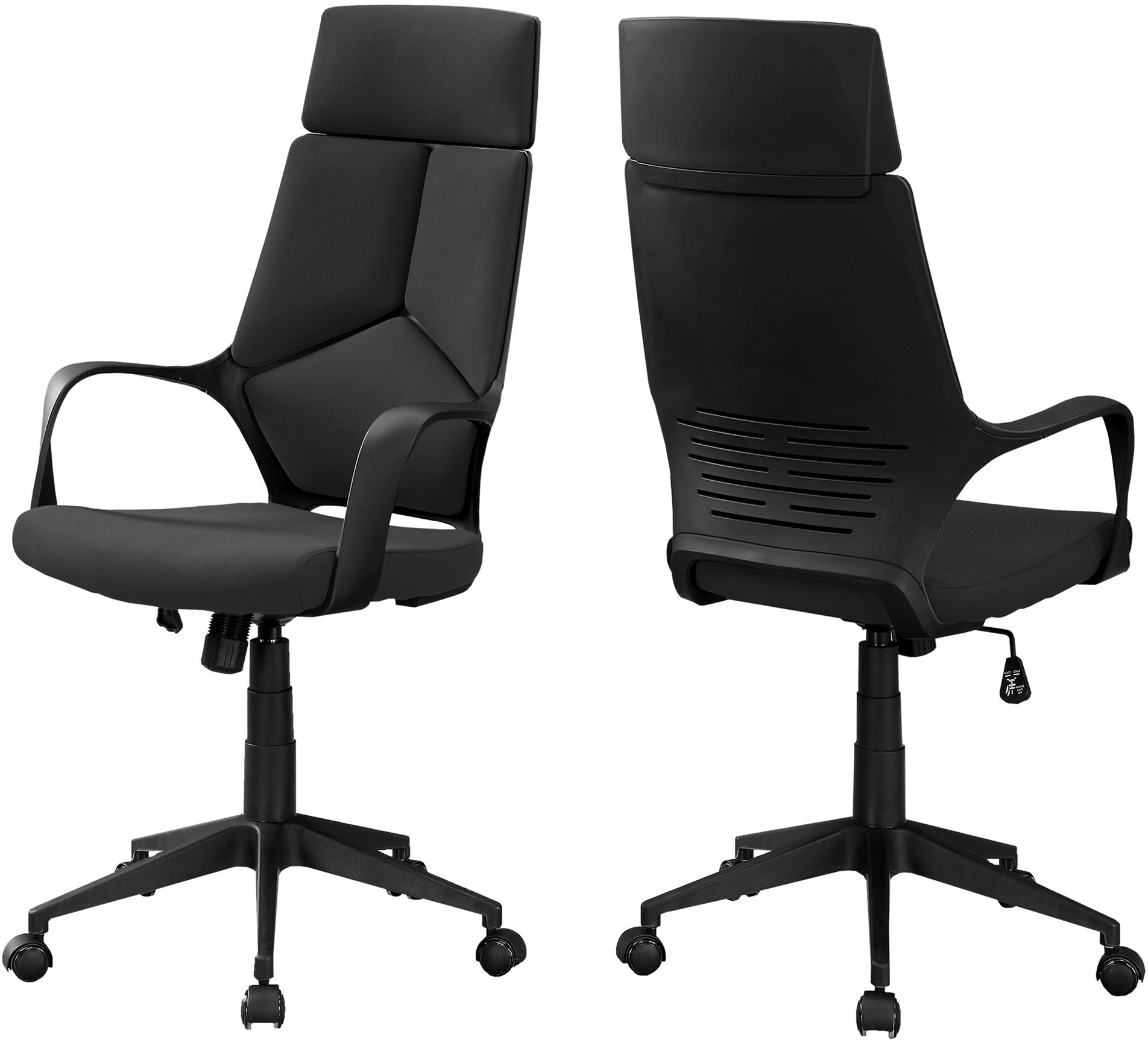 Increase your productivity with this chic and contemporary high back black executive office chair. BIFMA certified for home or commercial use, this high functioning swivel office chair is upholstered in a sleek and breathable black polyester fabric, and thick padding in all the right spots for ultimate comfort. The cushioned seat is adjustable to your desired height with a tilt back lock-in mechanism. The sturdy metal base with capped five nylon castors smoothly glides across the floor for easy mobility. This stylish and easy to assemble executive chair gives a fresh new look to any office space.