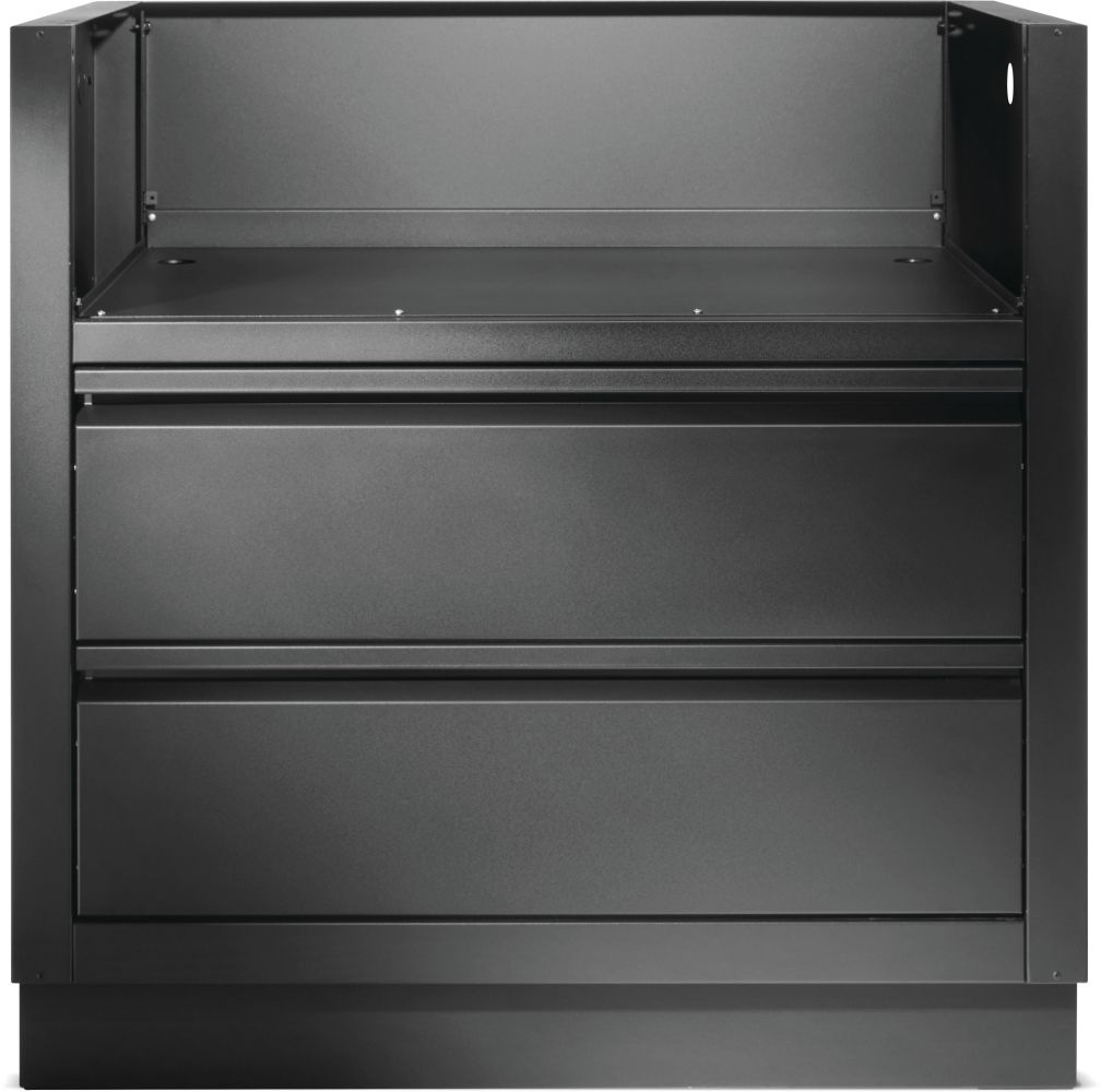Specially made for the Built-In 700 Series 32" Gas Grill Heads, this Matte Black colored, powder coated, galvanneal cabinetry features increased durability from the two-coat pebbling finishing system. Two stainless steel drawers are mounted on smooth gliding tracks for under grill storage. Installation is a breeze with knockouts for gas and electrical. Levelling feet ensure a balanced surface, even if your patio isn't perfectly level. Partner this cabinet with the Built-In 700 Series 32" Gas Grill Head and the perfect OASIS® cabinets for a custom outdoor grilling OASIS®.Read More